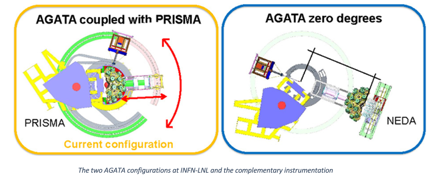 AGATA is currently installed at INFN-Laboratori Nazionali di Legnaro (INFN-LNL) in Italy, where two configurations are planned. The first is coupled to the PRISMA magnetic spectrometer and focuses mainly on experiments involving multinucleon transfer reactions (MNT) and fission. The second configuration, called “Zero Degree,” aims to experiment with stable high-intensity beams and radioactive beams with several complementary detectors, one of the most relevant being the NEDA neutron multidetector [1].