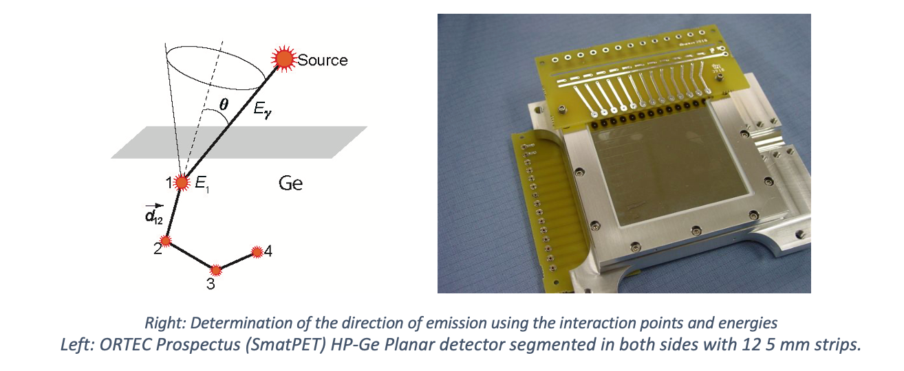 This research focuses on technological advancements in Compton Imaging and Medical Physics applications, leveraging previous expertise and collaborating with specialists in sensors, analog electronics, and instrumentation. The primary objective is to enhance knowledge and capabilities related to precise target or patient positioning in medical imaging. Several research groups within the AGATA collaboration, including those from the University of Liverpool, IPHC Strasbourg, KTH Stockholm, and GSI Darmstadt, have been investigating the use of planar strip HP-Ge detectors for Compton Imaging. The text mentions the procurement of a prototype SmatPET planar Double side strip HP-Ge detector, which is currently undergoing testing. However, further instrumentation and characterization are required for optimal performance.